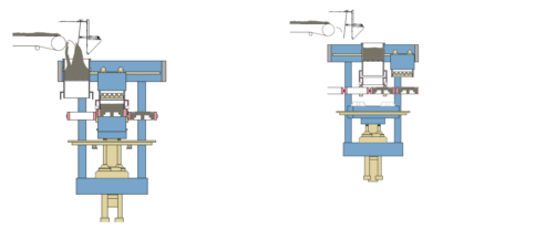 靜壓造型機(jī):主要包括舉升工作臺(tái)、吹氣預(yù)緊實(shí)裝置、多觸頭壓實(shí)裝置、百葉窗式加砂裝置、型板回轉(zhuǎn)裝置和上機(jī)架移動(dòng)裝置等,完成定量加砂、造型、起模和型板轉(zhuǎn)換等工序。